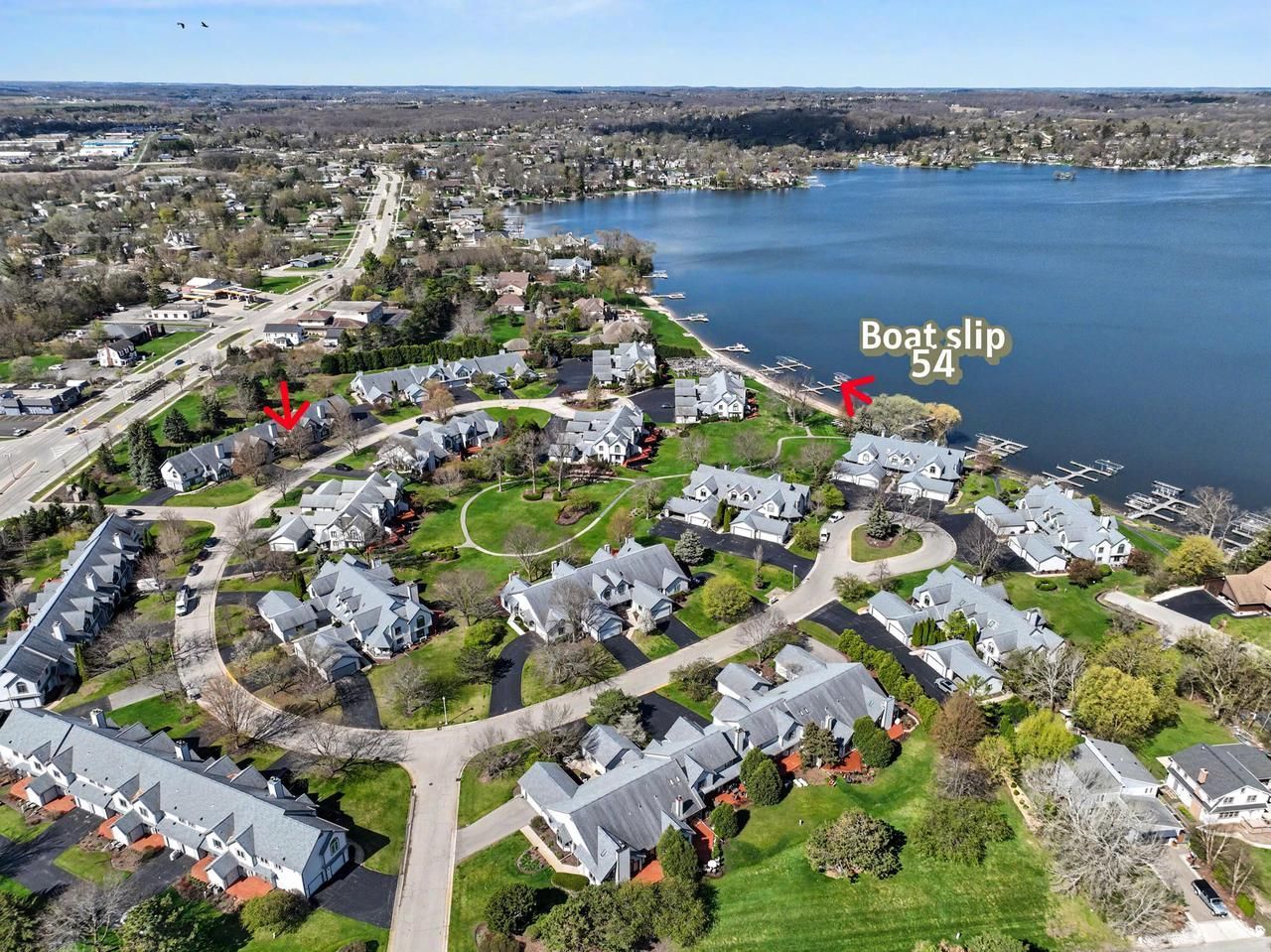 Beautifully maintained condo offers the ultimate lake lifestyle w/Little Muskego access steps away along w/deeded boat slip. Enjoy time on the lake soaking in the scenic surroundings. Inside, a spacious layout features warm living area w/gas FP, vaulted ceiling, & sun-filled windows. Eat-in kitchen w/breakfast bar, pantry, & ample cabinetry flows seamlessly for entertaining. Main floor laundry & powder room add convenience. Upstairs, primary ensuite offers 2 closets, bright windows, tiled walk-in shower, jetted tub, & quartz counters. 2nd BR & full BA complete upper level. With a poured basement, 2 car GA, low-maintenance living, peaceful setting & mechanical updates including furnace ('16), CA ('18), most windows ('19 & '21) & water heater ('15), this condo delivers on all fronts!
